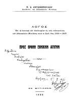 Λόγος. Προς Ορθήν Εθνικήν Αγωγήν Λόγος του διευθυντή του διδασκαλείου Μυτιλήνης Π. Δ. Αντωνόπουλου κατά την απονομή των απολυτηρίων στους επιτυχόντες του σχολικού έτους 1934-1935