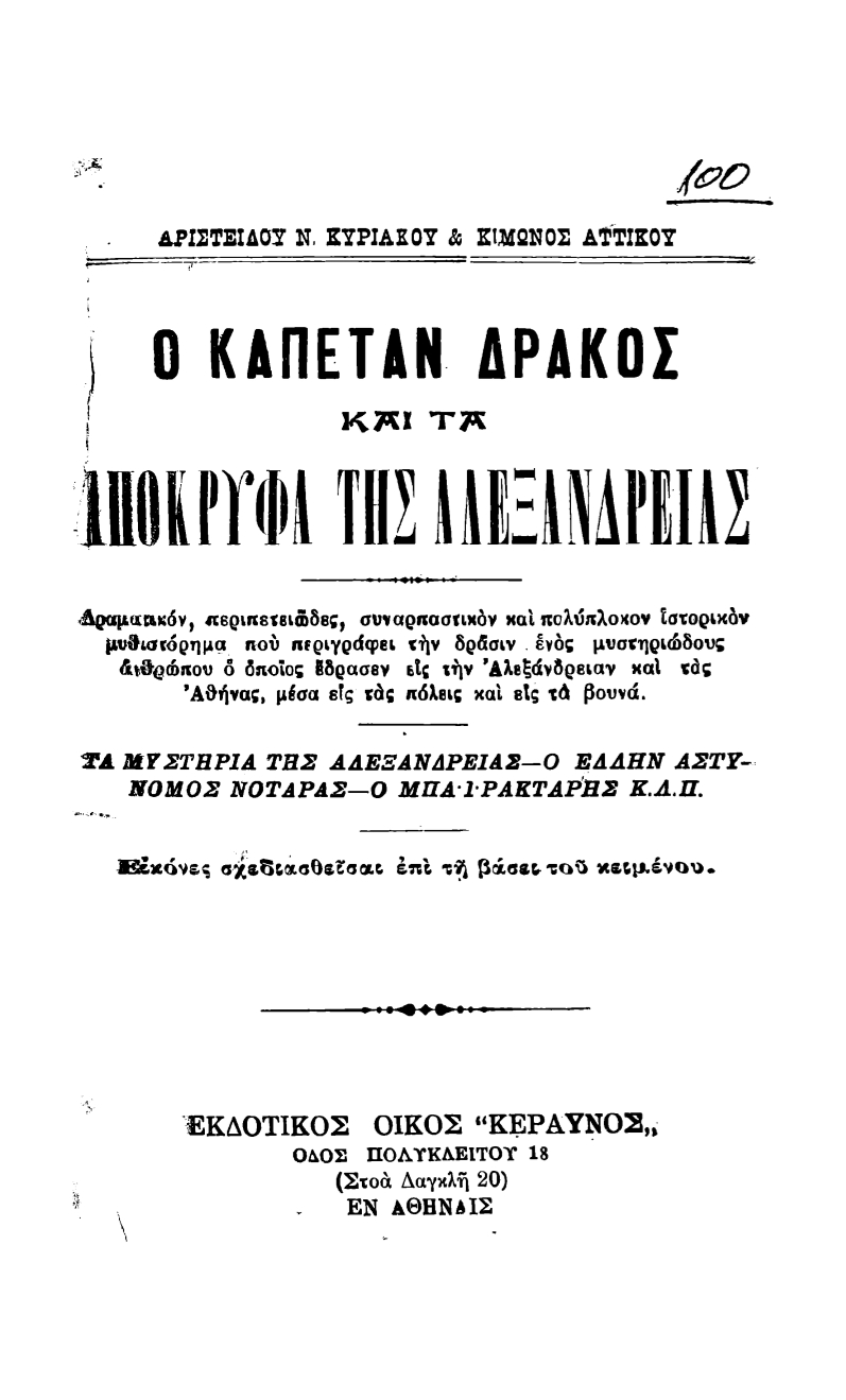 Ιστορικό μυθιστόρημα με πρωταγωνιστή τον χαρακτήρα Καπετάν Δράκο. Τα γεγονότα διαδραματίζονται στην Αθήνα και την Αλεξάνδρεια.