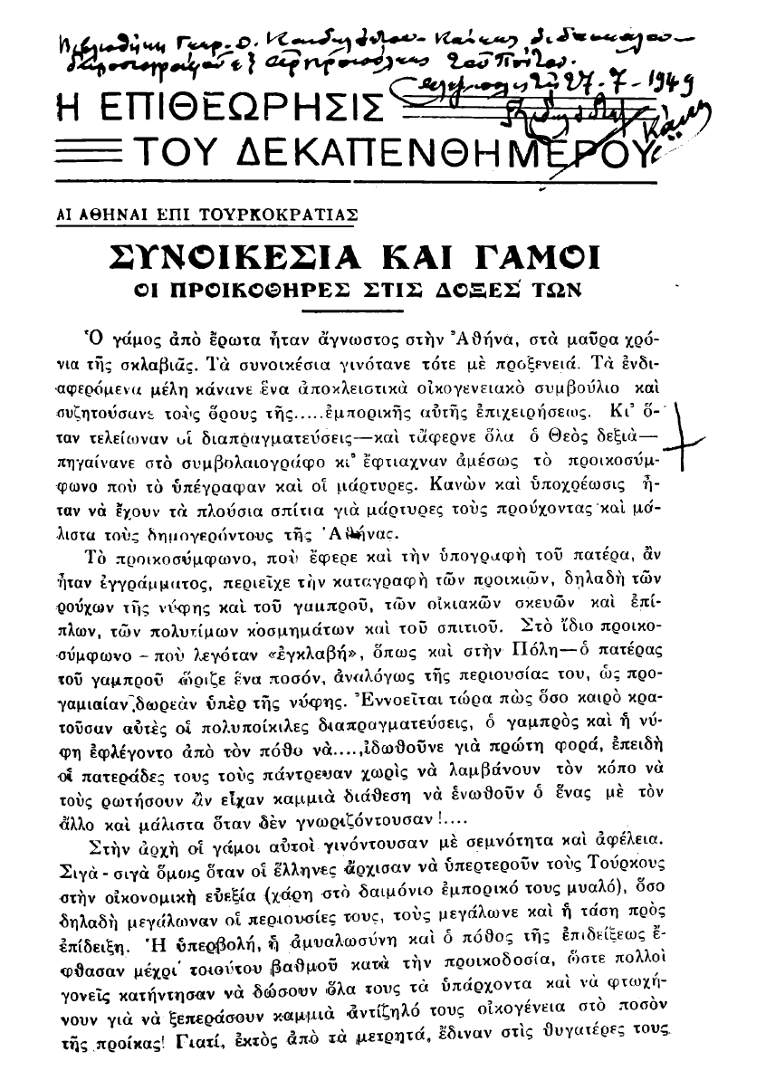 Τεύχος του περιοδικού "Η Επιθεώρησις του Δεκαπενθημέρου" με σχολιασμό κοινωνικών ζητημάτων και αποσπάσματα λογοτεχνικών κειμένων.